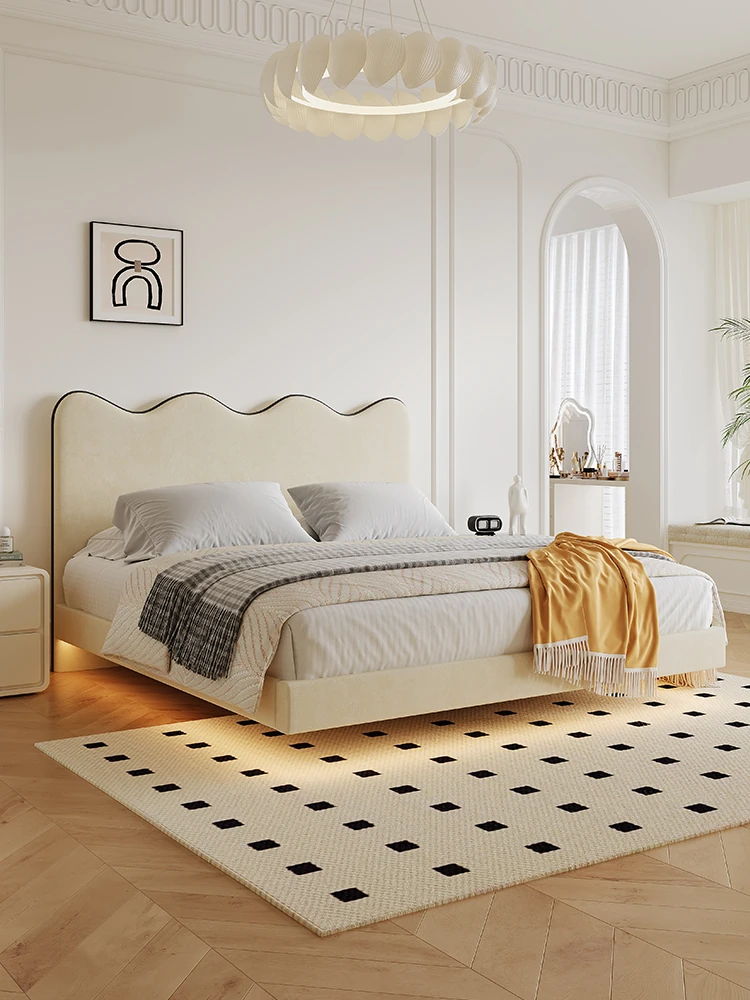 クリーミーウェーブデザインのモダンミニマリストベッド|ラグジュアリーでスタイリッシュなライト付きダブル浮遊ベッド|女性向け主寝室に最適なイタリアンスタイルのデザイン。