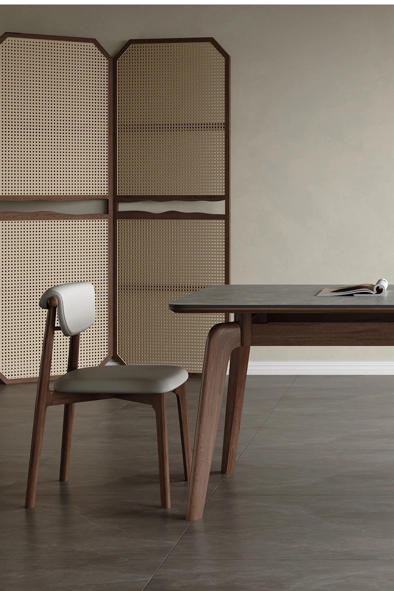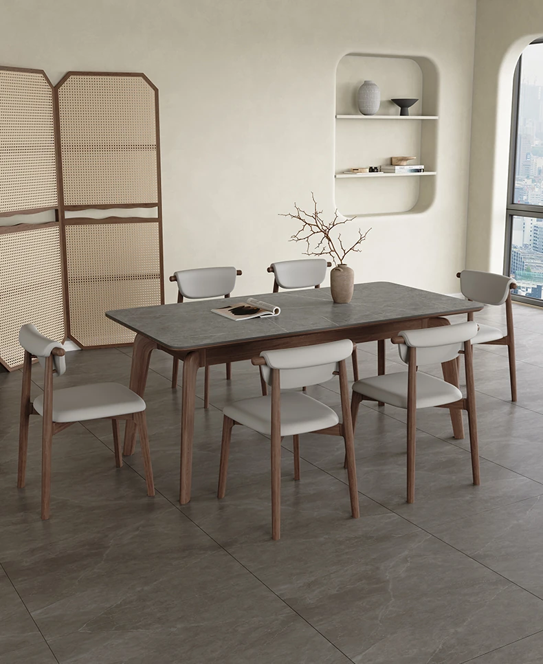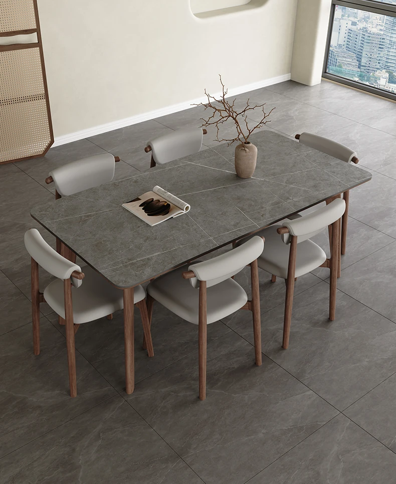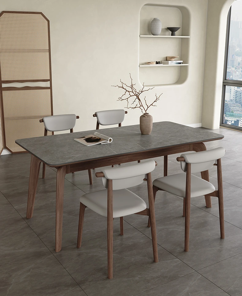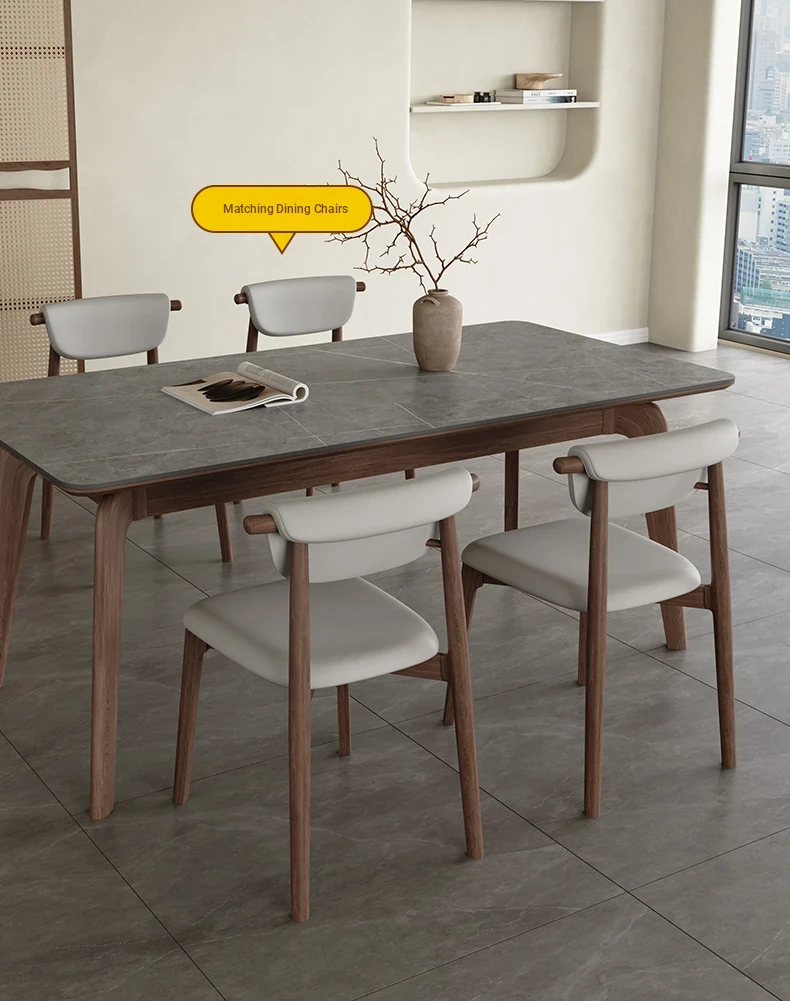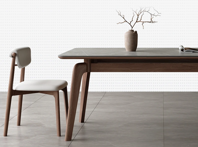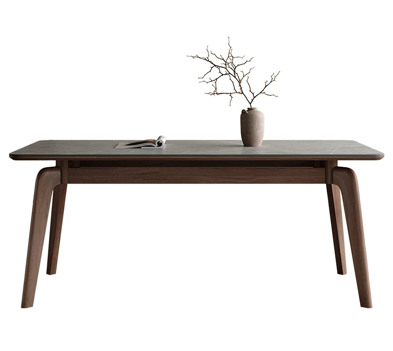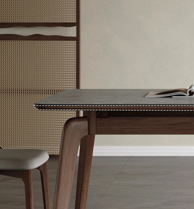 Elegant Solid Wood Dining Table - Modern Rectangular Design in Premium Walnut Color with Floating Nordic Grey Marble Top for Luxurious Home Dining Experience