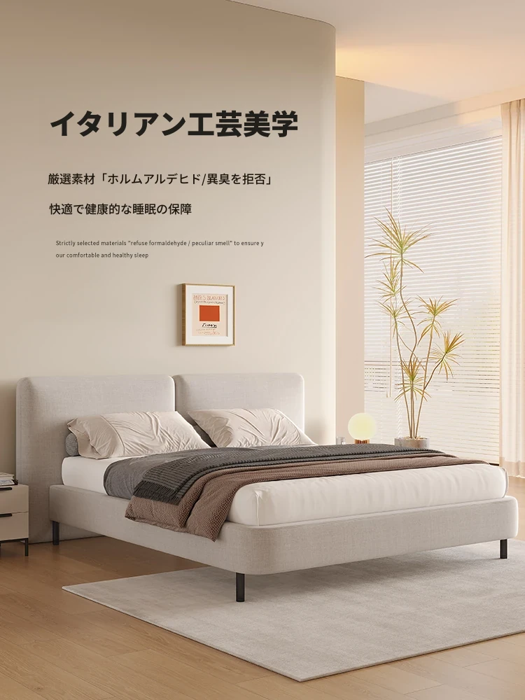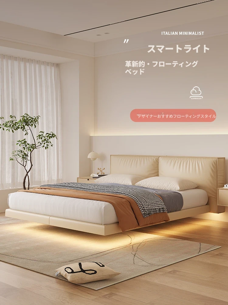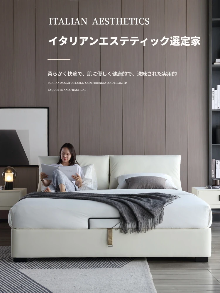 イタリアンミニマルデザインの本革ベッド - モダンでシンプル、小型住宅に最適!1.8メートルの北欧スタイル、トップグレードの牛革ダブルベッドで、ラグジュアリーな寝室を演出します。