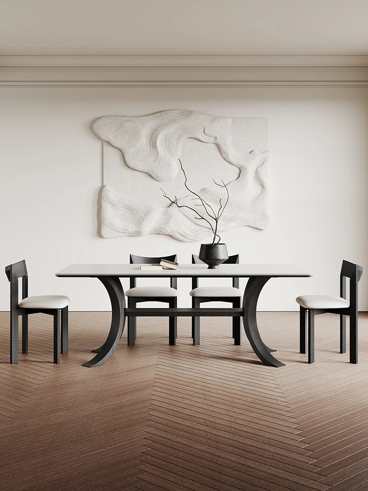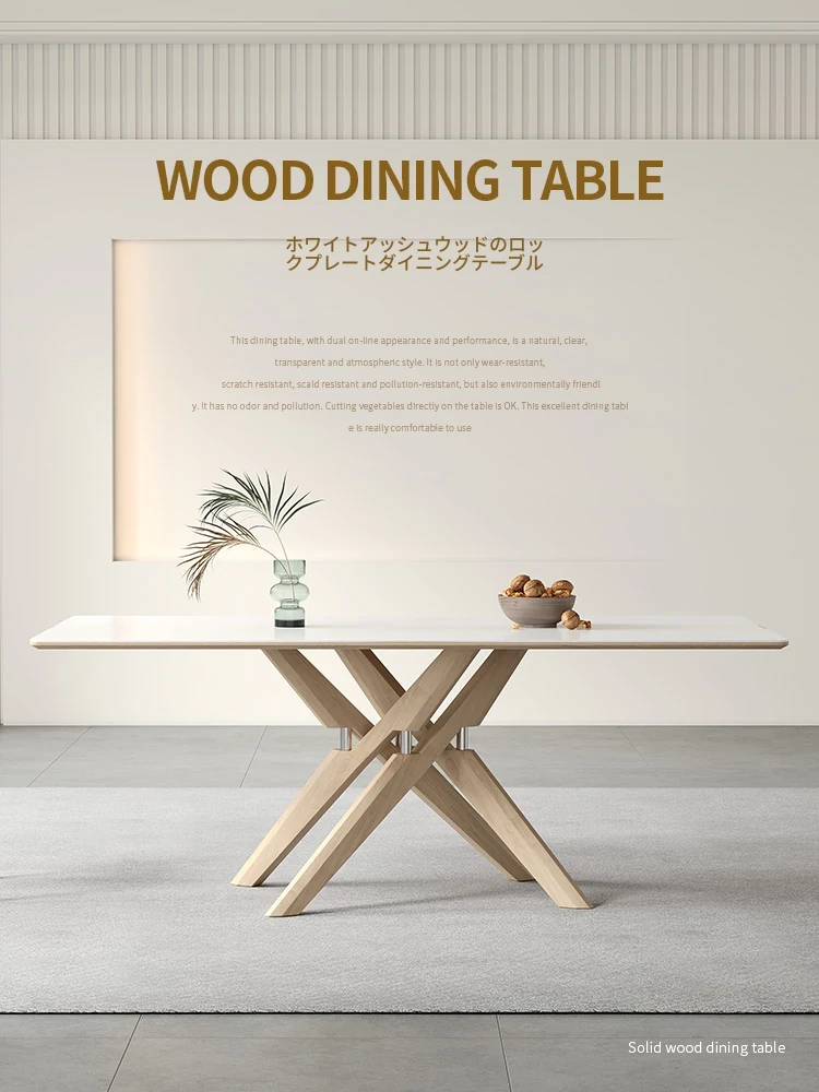 レトロな無垢材のロックプレートダイニングテーブル|家庭用長方形・モダンでシンプルなイタリアン侘び寂びスタイルの純白全托ロックプレート食卓。おしゃれな空間を演出し、食事のひとときを特別なものに!