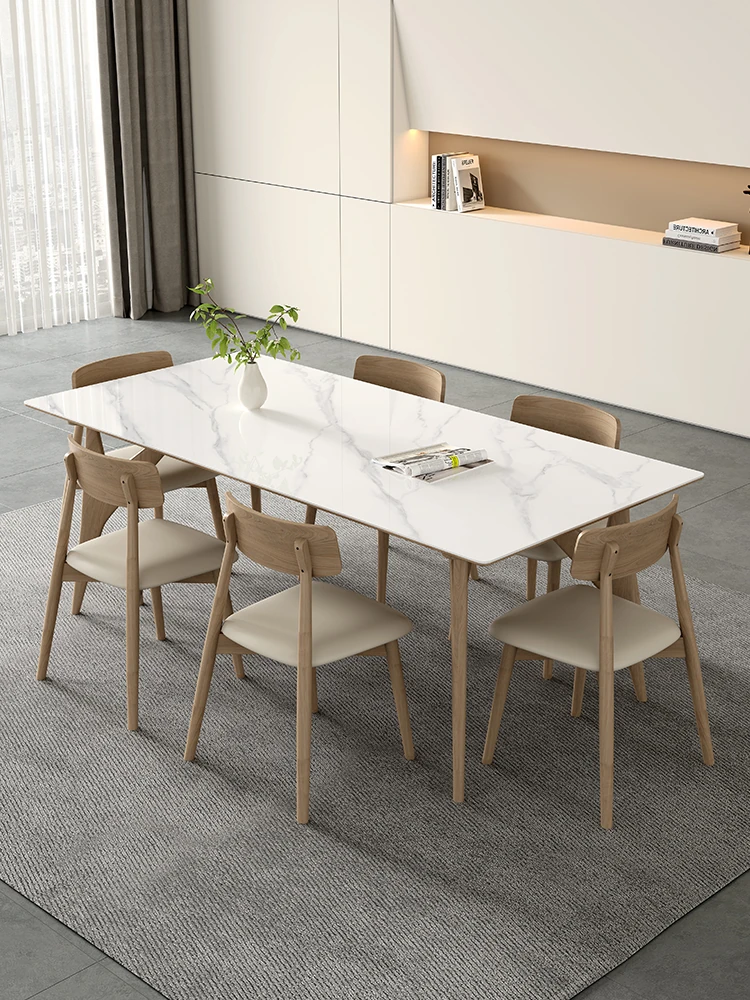 ワビサビ風デザインのハイグロス岩板ダイニングテーブルセット・ホワイトアッシュ無垢脚・モダンミニマリスト・家庭用・長方形・食事を楽しむためのスタイリッシュな選択!