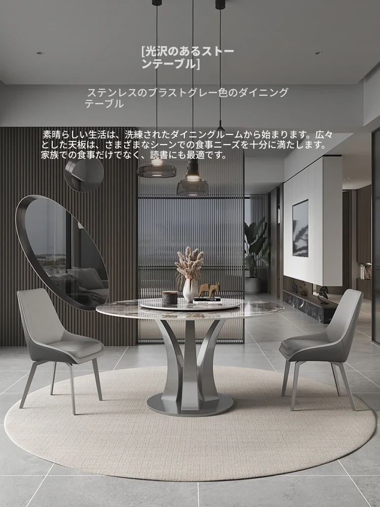魅力的イタリアンミニマリズム!回転式のラウンドテーブル、コンパクトな小スペース用。高級感あふれる現代的なデザインのロックプレートダイニングテーブル&チェア!